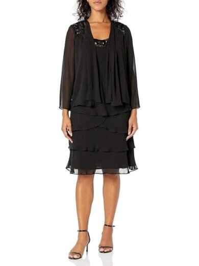 S.L. Fashions Women's Tiered Dress and Coordinating Jacket Two-Piece Set, Black, 10