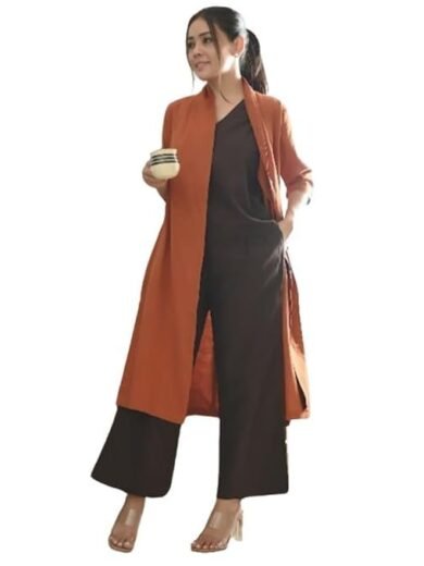 Saltpetre Women Coffee Brown Top & Trouser with Rust Long Shirt 3 Piece Co-Ords Set