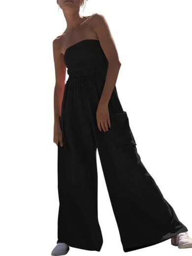 Feager Women's Oversized Strapless Off Shoulder Tube Top Jumpsuits Casual Wide Leg Long Pants Jumpsuits Rompers with Pockets