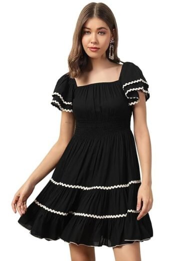 DEEBACO Solid Rayon Smocking Tiered Dress for Women's|Short Layered Bell Sleeves Square Neck Above Knee Length Dress|Summer Wear Girls Dress Western Party Casual Wear Outfits for Ladies