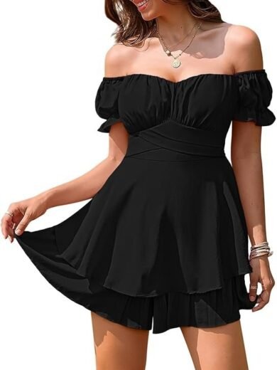 Linsery Women Boho Off Shoulder Romper Floral Print Tie Back Ruffle Hem Chiffon Short Jumpsuit